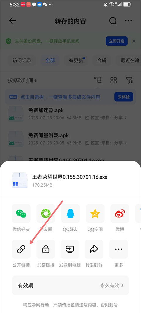 2、接着就可以分享到百度网盘app中,如果手机中没有安装百度网盘app,可以分享链接,然后使用网页版百度网盘进行转存