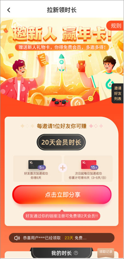 邀请一个新用户最高可得20天会员,多邀多得,上不封顶。(被邀请的用户也可以获得免费2天会员哦)