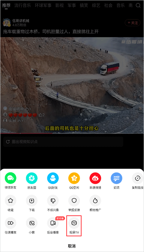 2、点击视频对应的分享图标”↗“按钮,选择投屏tv即可。