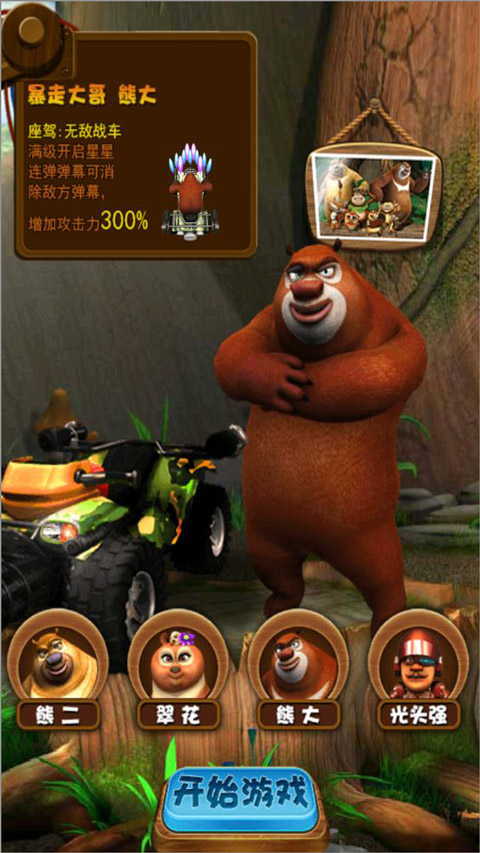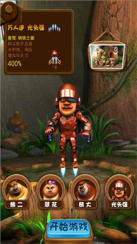 1、玩家进入游戏后丛第一关开始玩起,玩家可以选择不同的角色形象开启游戏(包括熊大、熊二、光头强、翠花);