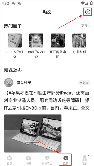 1、点击底导栏移动到“动态”,点击右上角的“+”,就可以进入到动态发布页面;