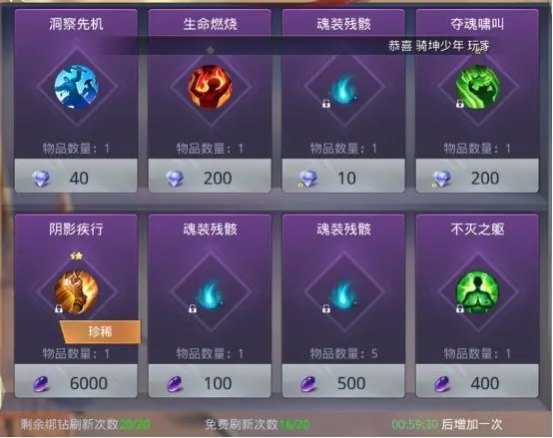 其中魂石可以直接到神秘商店兑换魂装道具或魂装技能,神秘商店有20次免费刷新次数,刷新有概率出现高级稀有魂装技能!