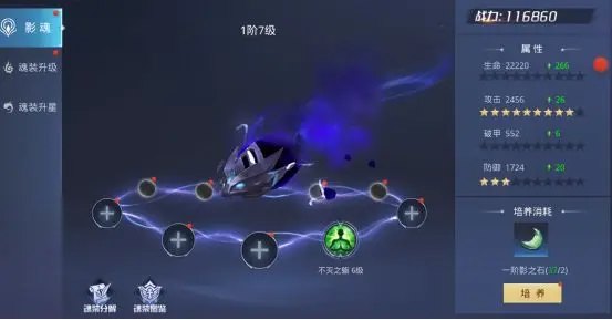 2星或以上的魂装还可以进行升星,升星需要消耗2星魂装和影魂精魄进行提升,建议玩家把多余的1星魂装分解,2星魂装用来进行升星,升星可以大幅提升魂装属性!