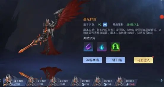 星光群岛副本于280级开启,副本内总共有三波怪物,击败每波怪物会刷新首领,击败首领可得到魂装道具,副本内击败怪物越多,获得魂石越多!