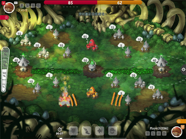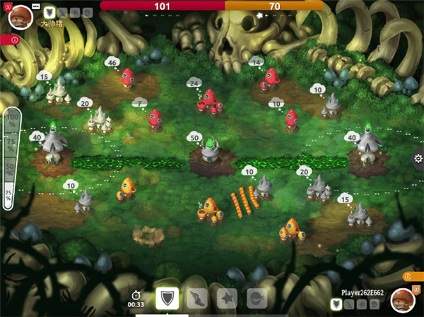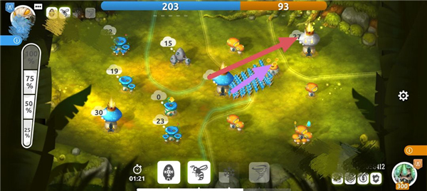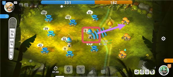 当首领拥有一定实力(人(菌)口)后,便可以调兵遣将向四周进行扩张。出征时,可以通过调节左侧的百分比进度条,选择不同建筑内想要派出的士兵数量比例(25%、50%、75、100%)