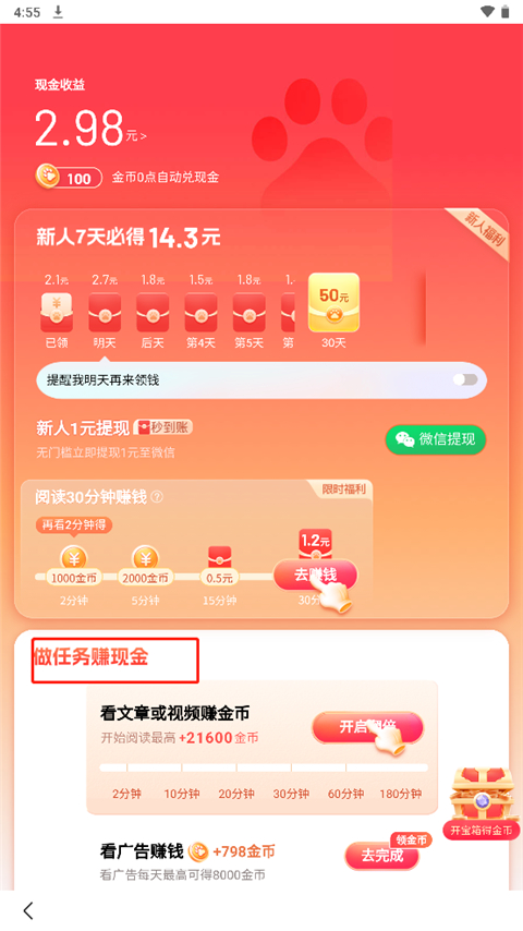参与活动的朋友可以完成任务页面的相关任务来获得金币,完成任务后能得到对应的金币。通过审核的金币需要手动兑换成现金,计入个人账户中。游戏任务包括有完成签到、开宝箱、晒收入、阅读资讯、观看视频等。