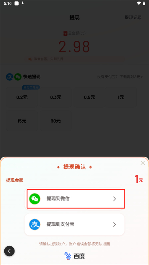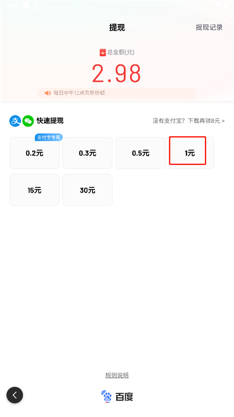 4、里面为用户提供了不同数量的提现金额,用户可以根据自己的现金总额来选择提现金额,如我们有2.9的总金额,点击1元;