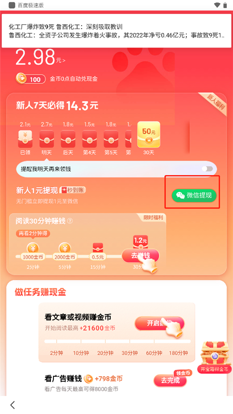 2、用户可通过百度极速版的相关规则赚取金币,金币可用于提现或参与活动等。