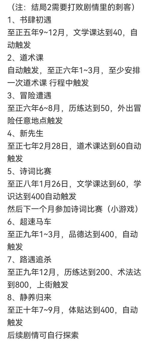 3、对联赢奖品至正六年9月10日好感度>=20 文学课>=20 4、茶馆展才艺至正七年2月11日好感度>=30 琴艺课>=40