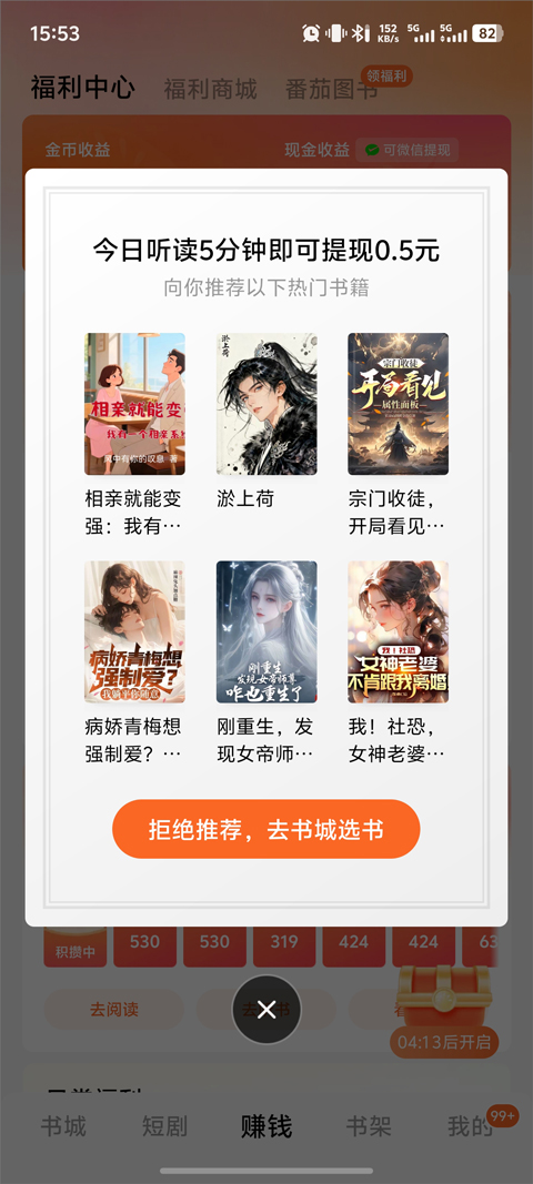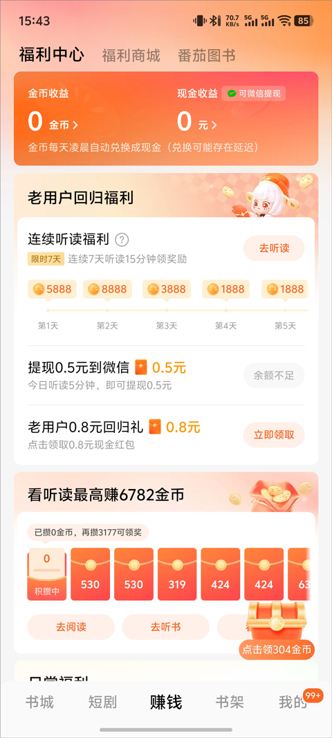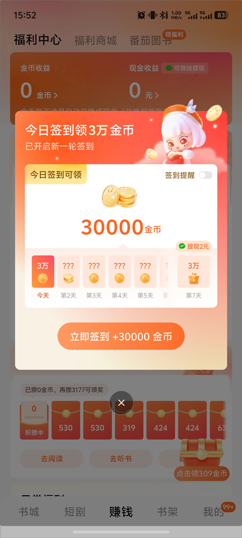1、打开番茄小说官方版,点击下方“赚钱”版块,用户每日签到可领取金币,1w金币可兑换1块钱现金收益;