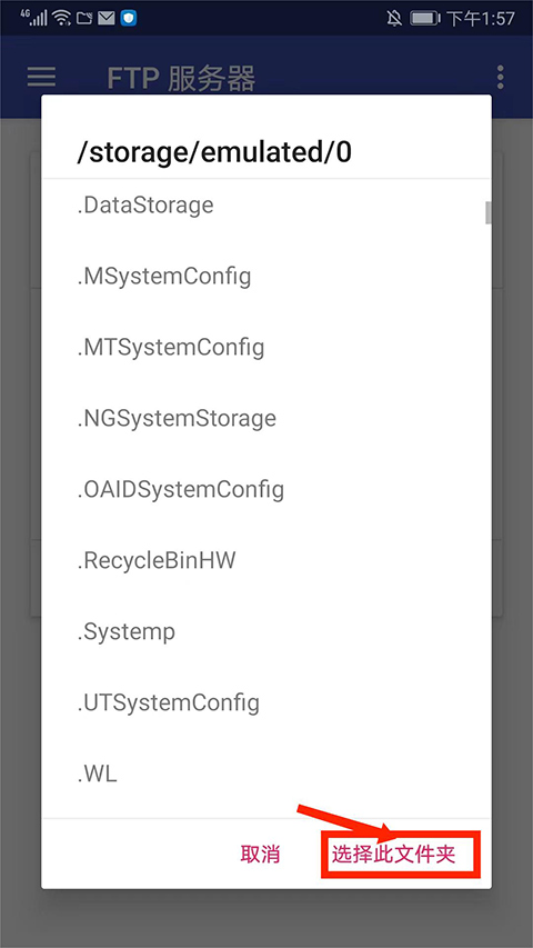 5、进入到文件夹选择界面,选择需要传送的文件所在的目录,点击右下角选择此文件夹,