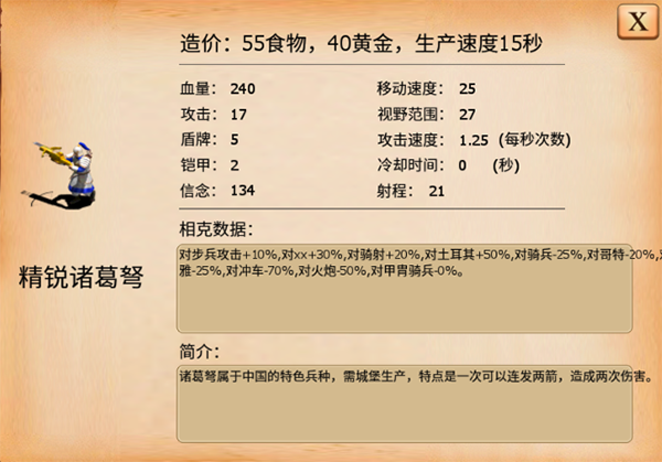 1、前期:快速建造城堡生产诸葛弩,配合少量骑兵骚扰条顿农民。