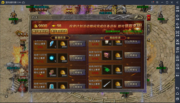 开启条件:普通奖励(9800传奇币)、高级投资(98元宝)