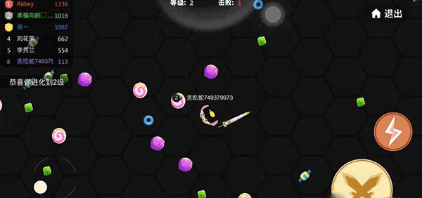 不仅如此,贪吃蛇大作战游戏的操作十分简单,玩家只需控制左下方的虚拟摇杆移动战斗,来吞噬屏幕中的能量点,滑动屏幕就可以调整贪食蛇前进的方向,点击箭头按键则可以让它加速移动即可,十分的容易上手。