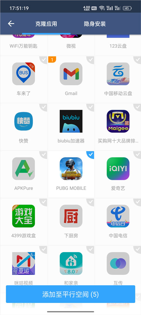 2、然后找到【pubg】勾选起来,点击【添加至平行空间】