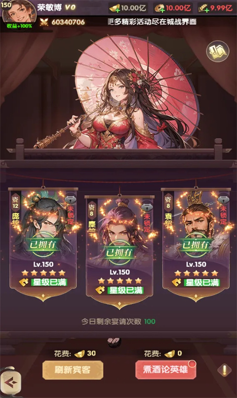 通过城池中的酒馆按钮,可进入酒馆。在酒馆中可宴请武将,并将其招募到你的队伍中。
