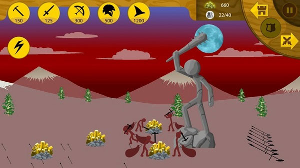 火柴人战争:遗产是一款比较经典的对战塔防游戏,首先第一件事就是获取资源,我们点击屏幕左上角的“锄头”按钮,可以召唤出挖矿的火柴人,它们拖着大包来挖矿,然后我们可以获得更多的矿石召唤战斗类的火柴人。