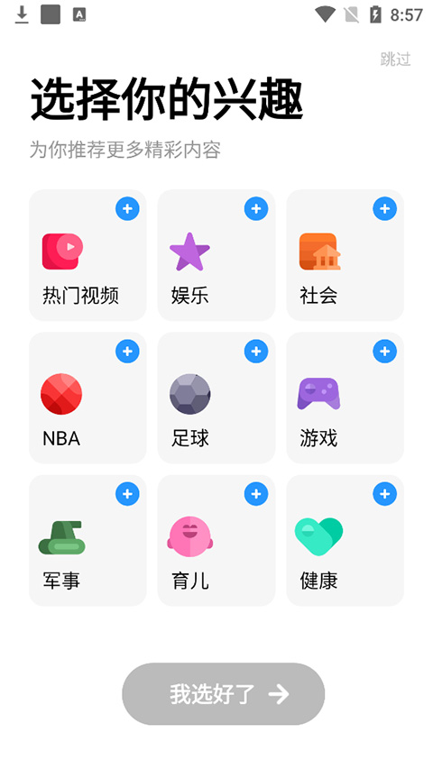 用户打开应用后可以根据自己喜欢的内容选择兴趣,也可以直接点击右上角的【跳过】不去做选择