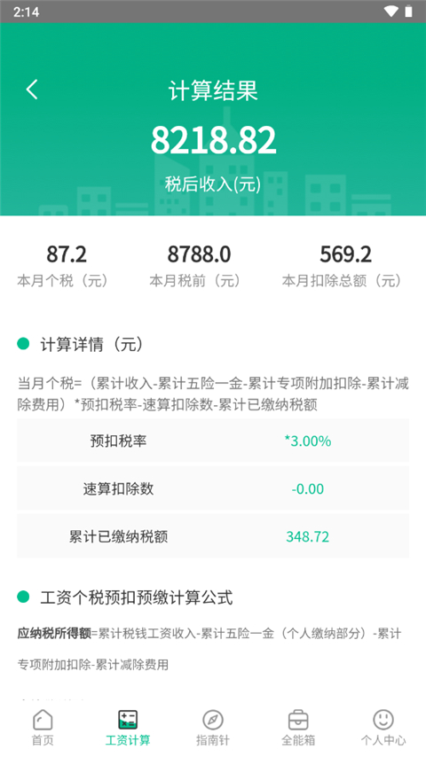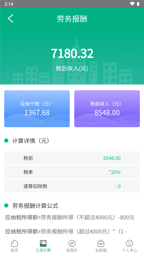 3、个税计算,支持全国100多个城市个税查询,个税一键计算,专项附加扣除自动计算,支持最新的个税计算方式。