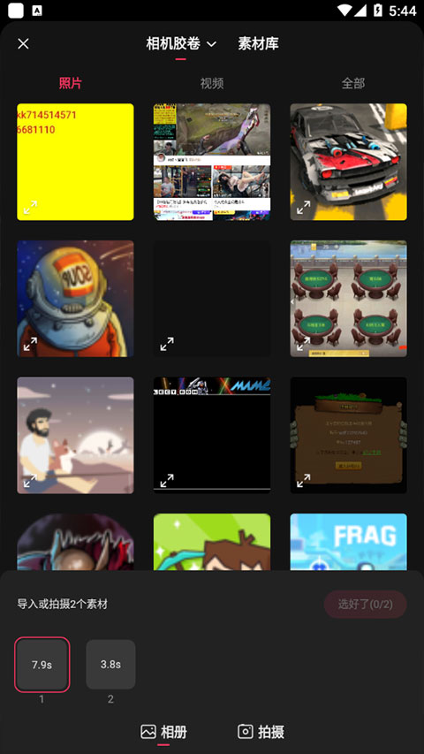 2、从相册选择视频/图片→ 勾选多段素材→选好了。