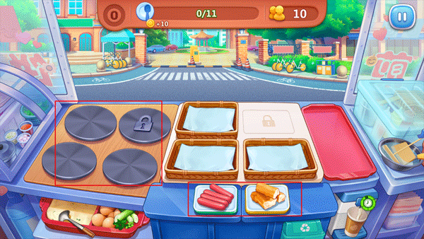 3、在做煎饼时,右上角的绿色圆圈表示它快要成熟的时间,如果变成了红色圆圈,就表示快要烧焦的时间。你只要在它立马变成红色圆圈时那个客人即可。你只要每天赚到一定数量的金币就可以关门啦!