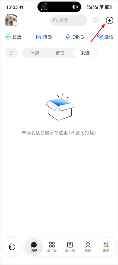 1、打开钉钉官方版,进入后点击右上角+号;