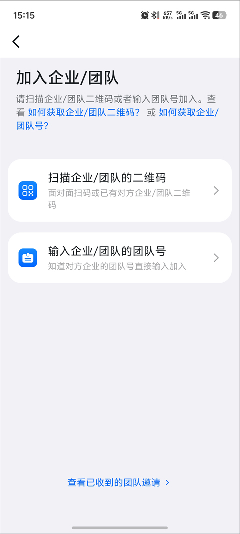 2、用户可通过扫描企业二维码,或者输入企业团队号加入;