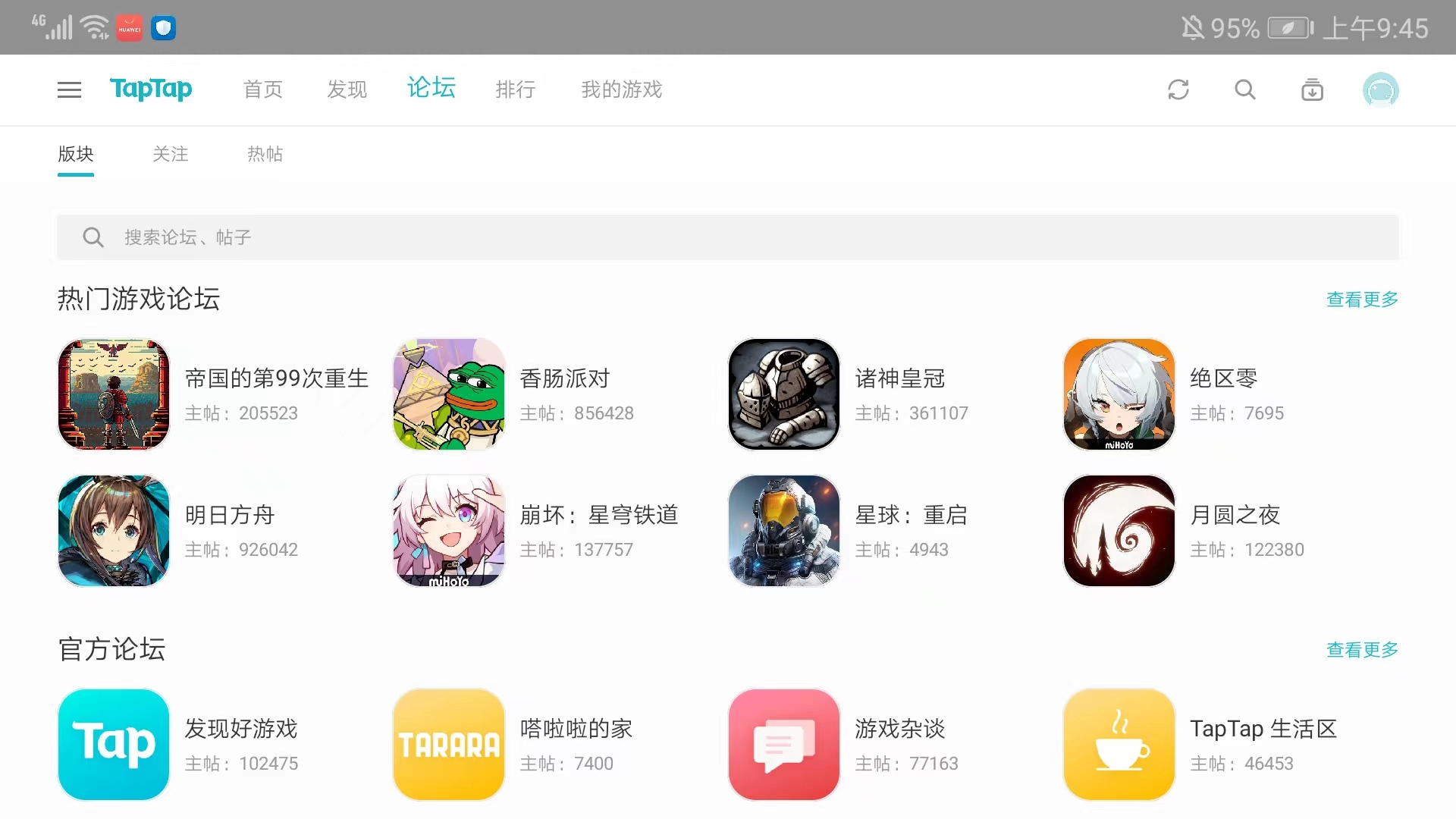 5、进入【论坛】界面,包括热门游戏论坛、官方论坛和个人论坛等不同的论坛,玩家可以在这里交流分享,