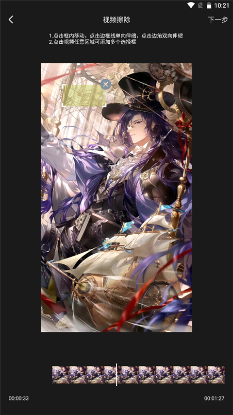 3、点击框内移动,点击边框线单项伸缩,点击边角伸缩,然后再点击视频任意区域可添加多个选项框,弄好之后点击下一步。
