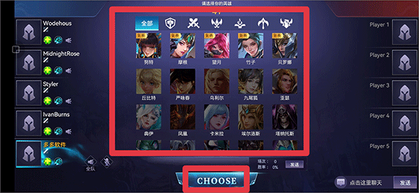4、接着进入到选英雄环节,在中间选择你拥有的角色并点击CHOOSE选定角色