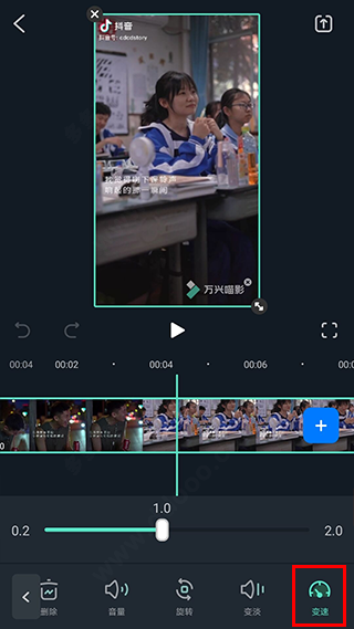 选中需要进行操作的视频片段,在底部工具栏中找到“变速”选项,移动滑竿调节速度效果