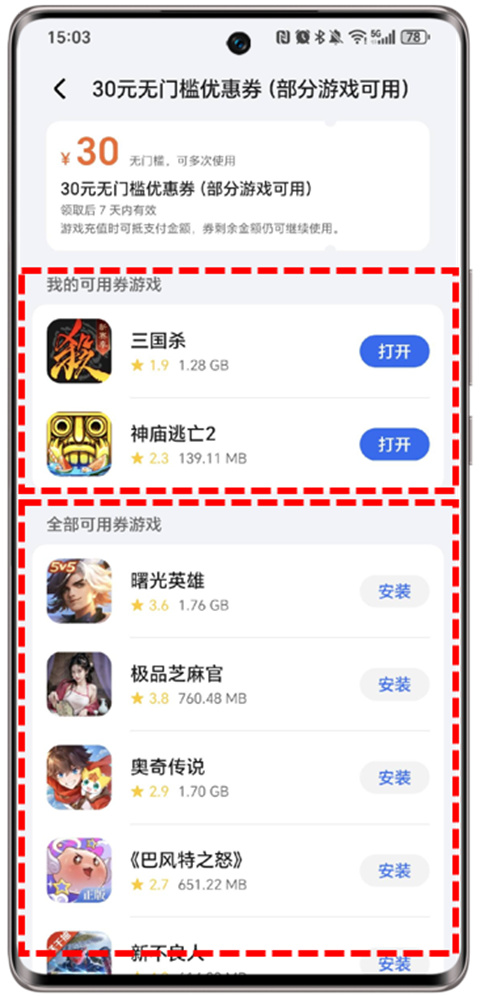 ⑦各优惠券使用范围、支持的游戏不同,可以点击优惠券后在详情页查看。在优惠券详情页中,如您已安装的游戏支持使用该优惠券,该游戏将在我的可用券游戏中显示。您也可以在全部可用券游戏列表中下载新游戏。支持的游戏名单不定期变化,请以实际为准。