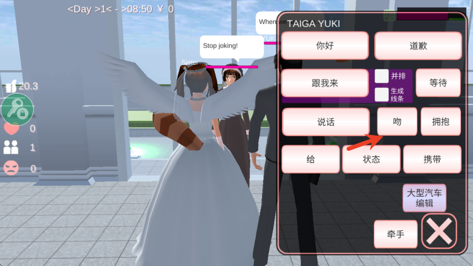 4、打开系统设置,把时间调到晚上八点,然后转过头,按对话选择Kiss(或者是亲吻、接吻等等),即可