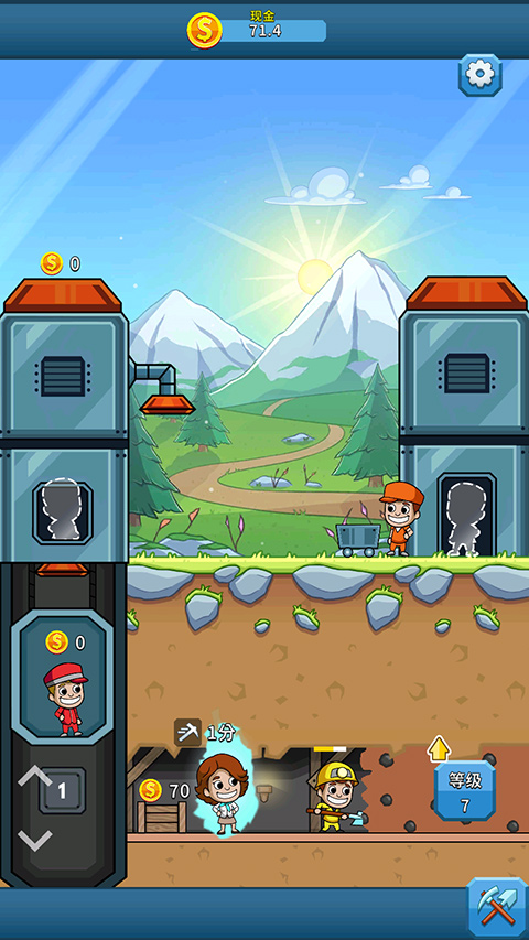 1、首先根据新手指引点击地下矿中的穿黄色衣服的矿工,然后他会进行挖矿,挖好矿后会背到左边靠近电梯的小箱子里面,这时点击在电梯中的红色衣服矿工,他会把箱子里面的东西传送到上方机器里面,然后点击在地面推小车的红衣服矿工,他会推着小车到机器下面接金币,送到原地。这三个矿工的规律性比较强,下面黄色的矿工可以一直进行挖矿,然后电梯里的矿工只需要吧挖好的矿石进行往上运送即可,地面上的工人,在机器下接住矿石推回原地就可以获取金币。
