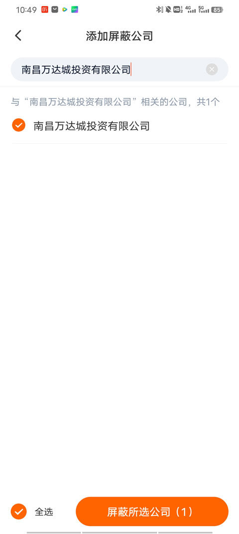 4、输入公司名,勾选你想要屏蔽的公司,选择屏蔽即可。