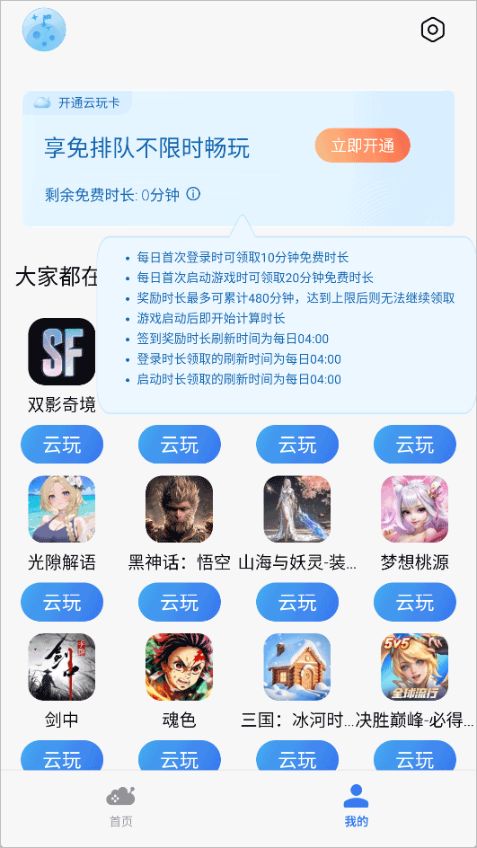1、用户登录小米云游戏app后就可以获取免费时长,然后就进入了游戏界面,里面的游戏不用下载的