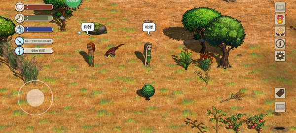打开右下角标签功能,部分动植物的名称就会显示。名称的背景有灰色和紫色两种。灰色背景道具为一般的道具,可以捡起手持;紫色背景的道具交互后会产生新的道具,如有果实的果树、有蛋的鸟巢都是紫色背景可交互,交互完成后可以得到能食用的果实和蛋。