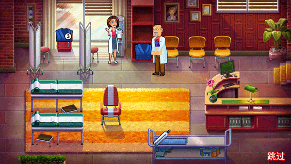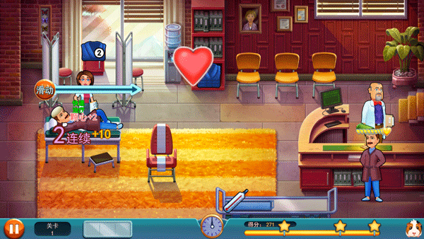 4、第一关非常简单,每位患者头上的心代表它们的整体健康,你的工作就是让他们以尽量多的心离开医院,同时病人的头上会显示要做的事。