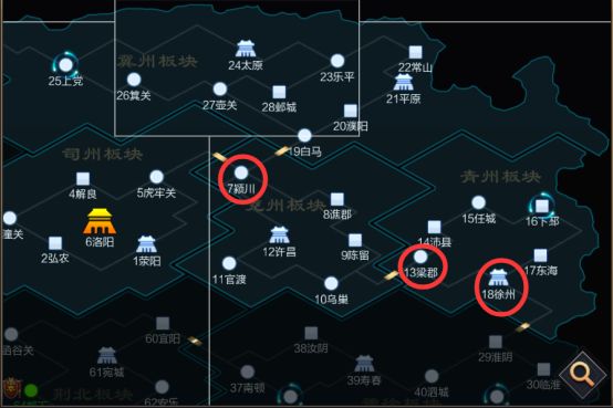 比如:13-梁郡与10-乌巢,是兖州与青州的唯一通道关隘,占领可阻断两州通往,再往东占领18-徐州可阻断通往豫徐板块,而大家要知道城池的编号是由小到大,也是城池解锁的顺序,所以18-徐州占领之后,可以获得下方所有板块的优先权,徐州是(100级以内)唯一通往下方城池的路口。