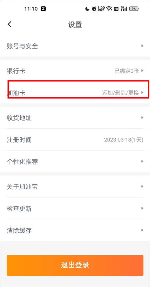 2、进入到设置页面之后,页面中有银行卡、加油卡,点击【加油卡】;