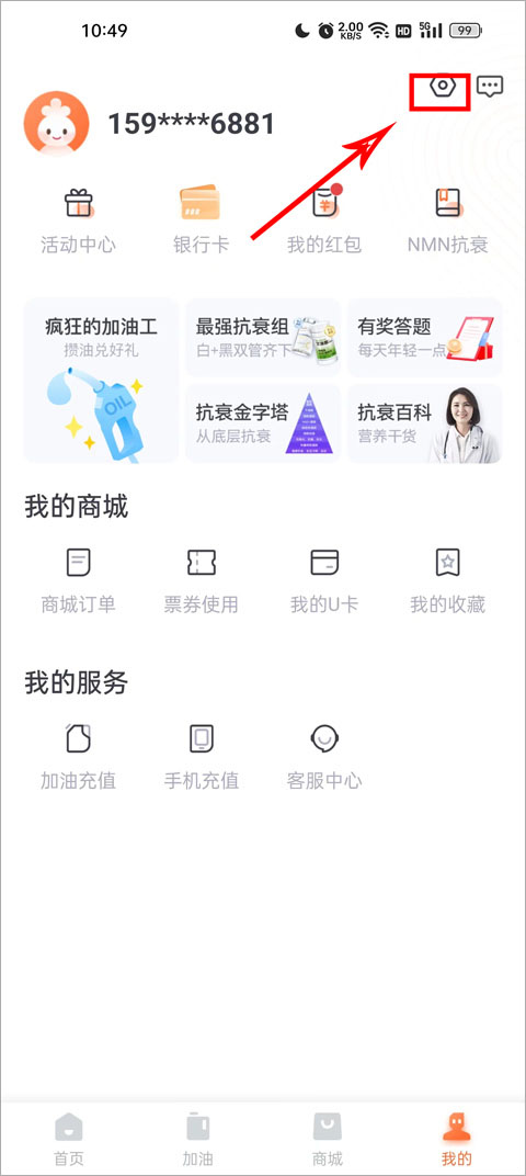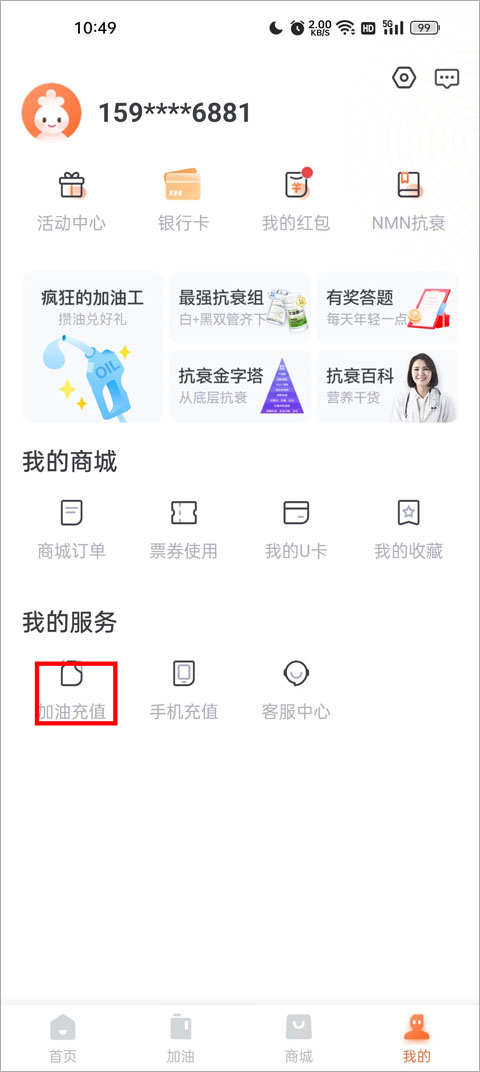 3、进入到我的页面之后,在我的服务中有一个【加油充值】的端口,点击进入;