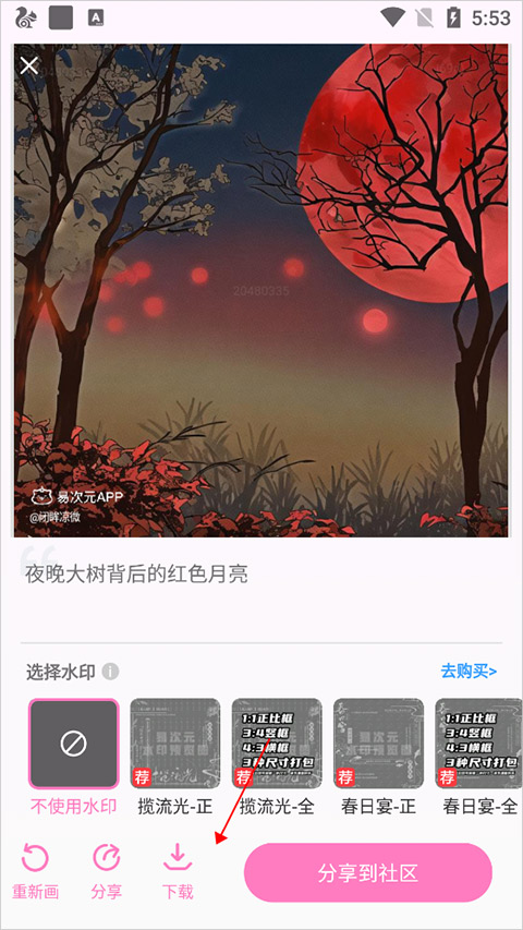 10、作品查看时可以对作品进行重画、二次加工、免费下载、分享等操作