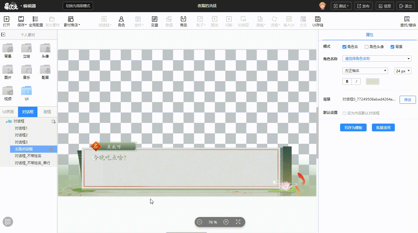 (2)接着切换到对话框栏,将导入UI里的的对话框设置为默认对话框。