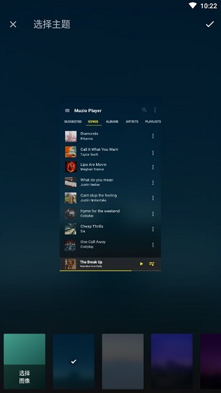 初始运行状态下,用户可根据自己喜好设置主题,由系统提供的数十款不同主题选择,基本能满足大量用户的需要,或者你也可以选择自己手机里的预存图片来打造个性化音乐播放器,在主题的后面,针对音乐播放器的颜色也有多项提供,喜欢的朋友可千万不要忘记哦。