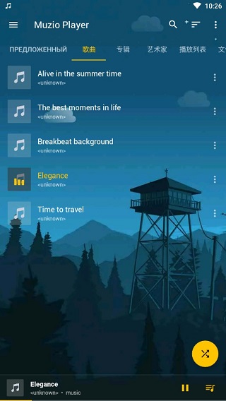 选择好主题之后,紧接着便来到了音乐播放器的主界面,在这里你可以选择自己喜欢的歌曲、专辑、艺术家,也可以查看当前的播放列表。