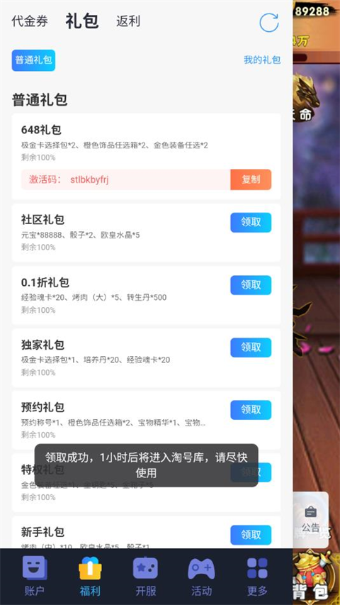 1、进入游戏后,点击游戏内悬浮窗,选择礼包,领取礼包码