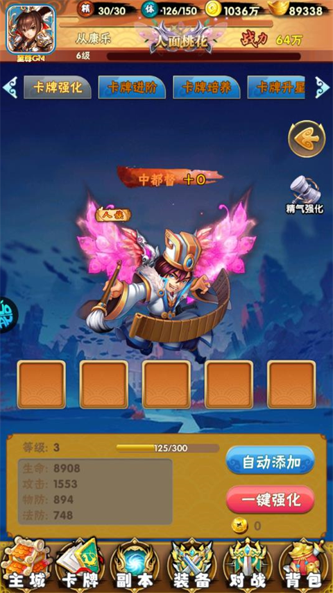 卡牌在培养页面可以消耗一定量的培养丹对卡牌进行培养,培养卡牌可以将卡牌的潜力转化为自身的攻击,物防,法防,血量四项属性,也可以将四项属性进行互相转换,卡牌进阶后,卡牌曾经培养变化的属性依然保留,因此在卡牌的任何阶段都可以对卡牌进行培养!