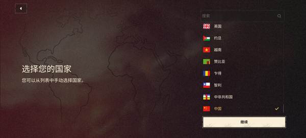 3、接着选择国家,下滑选择中国;