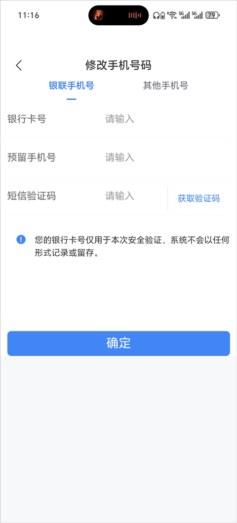 5、输入银行卡号、手机号,最后获取短信验证码点击确认就可以更换手机号了。