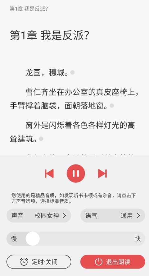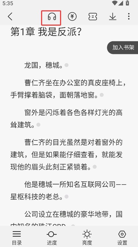 3、在小说阅读界面点击中间呼出ui,选择上方的耳机图标